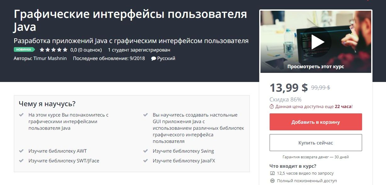 На этом курсе Вы познакомитесь с такими Java библиотеками графического интерфейса пользователя как AWT, Swing, SWT/JFace и JavaFX.