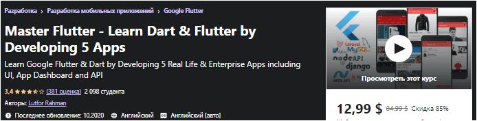 Изучите Dart и Flutter разработав 5 приложений. Вы разработаете 20 реальных и корпоративных приложений, включая пользовательский интерфейс, панель управления и API, а также станете полноценным разработчиком мобильных приложений.