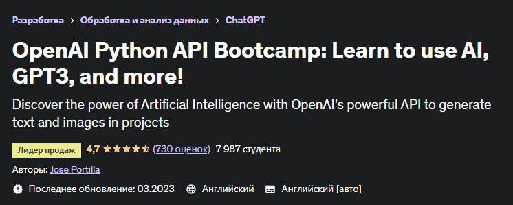 Итак, если вы готовы поднять свои навыки на новый уровень и исследовать мир искусственного интеллекта, запишитесь на этот курс сегодня и начните создавать интеллектуальные приложения с OpenAI API и Python! Вы можете изучить Udemy – освоение науки о данных, машинного обучения и искусственного интеллекта