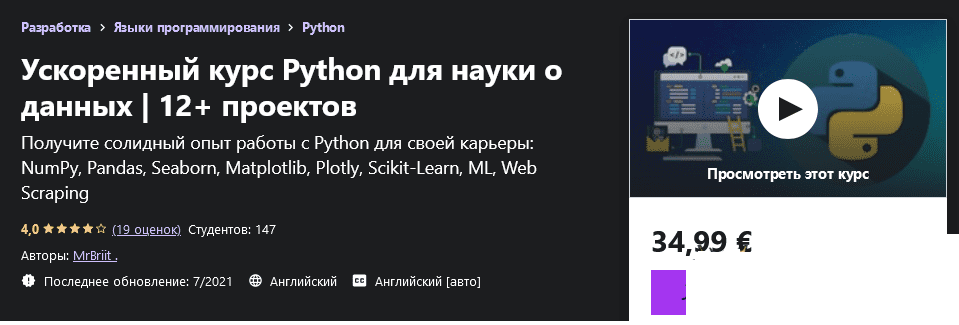 [Udemy] MrBriit - Ускоренный курс Python для науки о данных | 12+ проектов (2021)