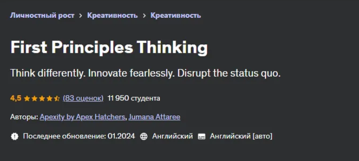В курсе описывается пошаговый процесс применения Первичных принципов: выявление проблемы, проверка предположений, разложение элементов, выявление основных принципов, а затем восходящие рассуждения для восстановления решений. Как учащийся, вас обучают преодолению предубеждений и развитию когнитивной гибкости и настойчивости. Методы творческого решения проблем, системное мышление, вероятностное рассуждение, анализ рисков и другие аналитические инструменты вводятся для улучшения навыков соблюдения Основных принципов.