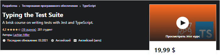 Краткий курс для разработчиков среднего уровня, желающих начать тестирование с использованием Jest и TypeScript. Первый раздел посвящен использованию Jest с JavaScript и немного разработки через тестирование. В остальной части курса используются TypeScript, Jest, Node.js или React. Курс длится 2 часа и в нем полно контента.