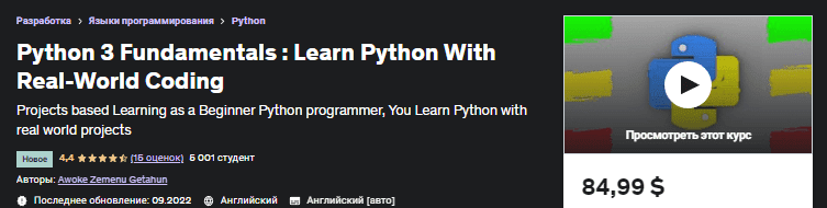 - Этот курс полностью посвящен фундаментальным основам Python, если вы хотите понять Python с реальными примерами использования и упражнениями, этот курс вам очень поможет.