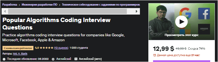 [Udemy] Популярные вопросы на собеседовании по кодированию алгоритмов (2022)