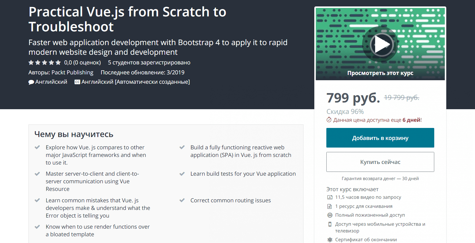 Vue.js - это JavaScript-инфраструктура с открытым исходным кодом для создания пользовательских интерфейсов и одностраничных приложений. С этого практического курса вы начнете изучать Vue.js с нуля, который научит вас, как создавать приложения в Vue.js. В дальнейшем вы также научитесь использовать различные современные инструменты веб-разработки с Vue.js, такие как Webpack, vue-cli, hot reloading и vue dev, чтобы обеспечить наиболее эффективную работу для ваших пользователей. Затем вы узнаете о создании сложных веб-приложений с помощью Vue.js, который включает в себя использование vuex для управления состоянием в приложении Vue.js, добавление связи с удаленными ресурсами в ваше приложение Vue и использование VueRouter 2 для создания одностраничного приложения. Наконец, вы узнаете некоторые общие методы устранения неполадок, чтобы решить наиболее распространенные проблемы, которые наиболее Vue.