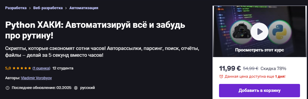 Ты до сих пор вручную переименовываешь файлы, рассылаешь письма и копируешь данные из таблиц? Тогда этот курс изменит твоё представление о работе навсегда! Python способен автоматизировать 90% рутинных задач, и я покажу, как превратить его в твоего персонального помощника.