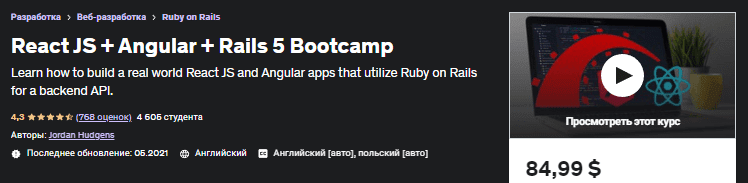 - Этот курс предназначен для разработчиков, которые хотят научиться создавать клиентские приложения реального мира с помощью таких фреймворков, как Angular и React JS, которые работают на внутренних API-интерфейсах Ruby on Rails.