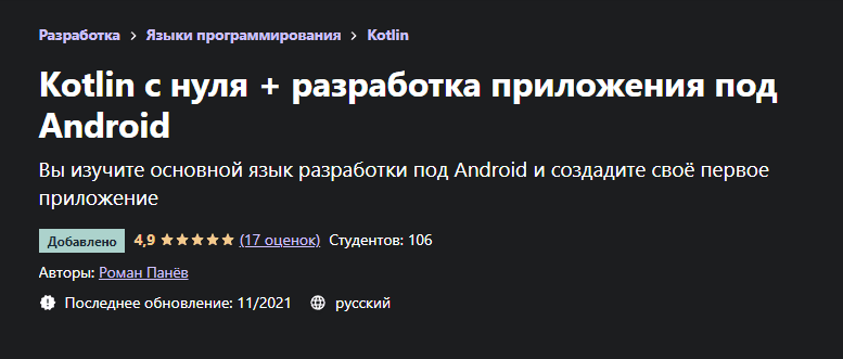 [Udemy] Роман Панёв - Kotlin с нуля + разработка приложения под Android (2021)