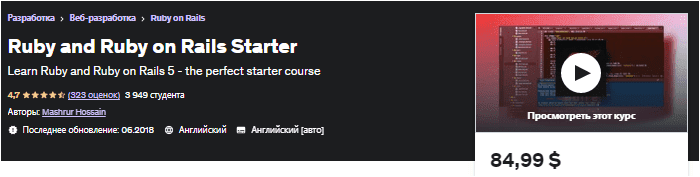 Начальный курс Ruby и Ruby on Rails, полностью переработанный и обновленный в ноябре 2017 года, представляет собой простое введение в программирование с использованием Ruby и разработку веб-приложений с использованием платформы Rails (Rails 5, но может быть применен и к Rails 4). . Этот курс предназначен для студентов, не имеющих опыта программирования, и является необязательным предварительным курсом для курсов «Полный разработчик Ruby on Rails» или «Профессиональный разработчик Ruby on Rails с Rails 5» здесь, на Udemy.