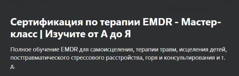 Добро пожаловать на эту аккредитованную IRAP сертификацию по терапии EMDR. Получите сертификат по EMDR и овладейте методами терапии десенсибилизации движением глаз / терапии EMDR с помощью нашей комплексной онлайн-программы. Узнайте о терапии десенсибилизации глаз, двусторонней стимуляции и терапии быстрым движением глаз для лечения травм. Погрузитесь в протоколы EMDR для ПТСР, тревожности и депрессии. Получите практические навыки лечения с помощью терапии EMDR и зарекомендуйте себя как обученного специалиста EMDR. Ищете ли вы терапию EMDR рядом со мной или хотите повысить свой терапевтический опыт, этот курс дает основные знания и методы для эффективной десенсибилизации и переработки движением глаз. Присоединяйтесь к нам, чтобы раскрыть преобразующий потенциал терапии EMDR и оказать долгосрочное влияние на исцеление травм.