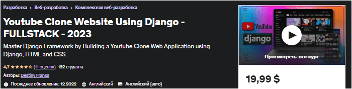 В этом курсе мы рассмотрим все, что вам нужно знать, чтобы создать веб-сайт с использованием Python, Django и многих других веб-технологий, создав полнофункциональный клон Youtube.