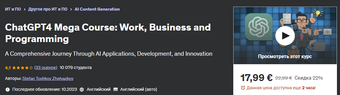 [Udemy] [Stefan Toshkov Zhelyazkov] Большой курс ChatGPT4: работа, бизнес и программирование (2024)