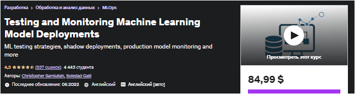 Этот всеобъемлющий курс, включающий более 70 лекций и 8 часов видео, охватывает все аспекты тестирования и мониторинга моделей. На протяжении всего курса вы будете использовать Python в качестве основного языка и другие технологии с открытым исходным кодом, которые позволят вам размещать и выполнять вызовы ваших моделей машинного обучения.