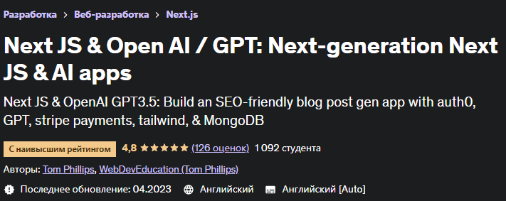 [Udemy] Tom Phillips - Next JS Open AI/GPT: приложения следующего поколения Next JS и AI (2023)