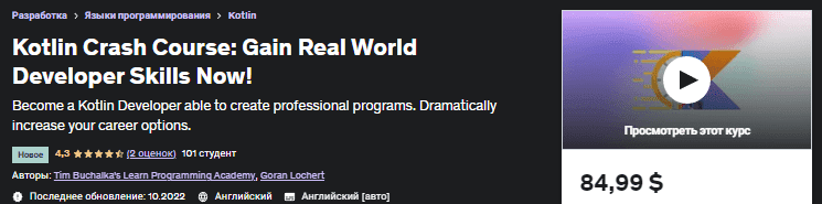 Зарегистрируйтесь сейчас , используя кнопку «Добавить в корзину» справа, и начните свой путь к карьере программиста на Kotlin. Вы также можете ознакомиться с некоторыми курсами, используя функцию предварительного просмотра на этой странице, так что вы на 100% уверены, что этот курс для вас.