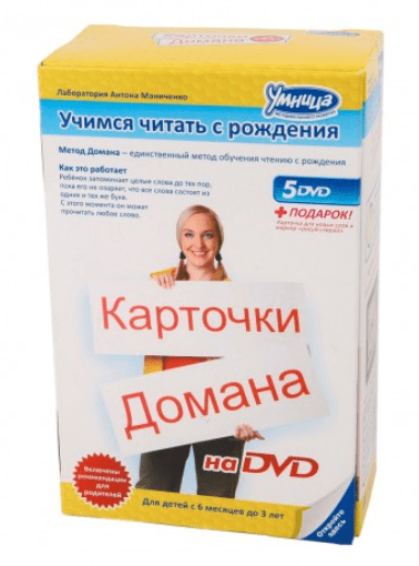 Видеокурс обучения чтению «Карточки Домана на DVD» включает 5 DVD-дисков, которые содержат 150 наиболее часто употребляемых слов и 600 словосочетаний с этими словами. На каждом диске от 8 до 12 разделов, в каждом из которых от 6 до 8 слов, словосочетаний.