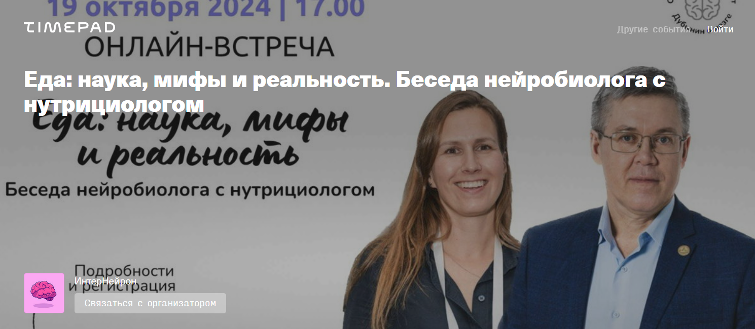 Онлайн-встреча! Вячеслав Дубынин, профессор, нейробиолог и Юлия Бережная, эксперт по питанию, нутрициолог в компании крупнейшем производителе продуктов питания и напитков, обсудят все самое интересное и актуальное о еде.interneuron.timepad.ru
