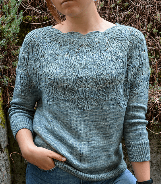 Это бесшовный свитер сверху вниз с кружевным узором на кокетке, а остальная часть выполнена из простого трикотажа.