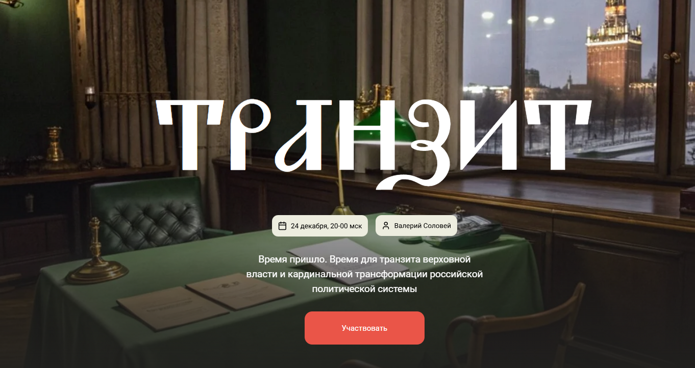 Драматическую историю ближайшего будущего России вы узнаете во время онлайн-встречи с Валерием Соловьем, самым осведомленным политическим экспертом страны.