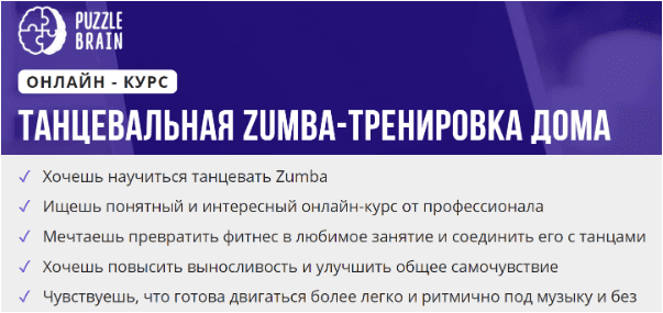 <ul><li>Узнай, какие ритмы бывают в Zumba и как под них двигаться</li><li>Узнай, как соединить кардио-тренировки и простые танцевальные движения</li><li>Научись красиво и свободно двигаться</li><li>Улучши состояние своего здоровья и подтяни фигуру</li></ul>puzzlebrain.ru