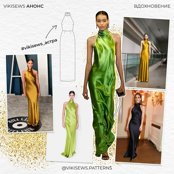 Выкройка платья малого объема, приталенного силуэта, отрезное по линии талии. На деталях переда нагрудные вытачки. Спинка открытая, с декором, в виде двойного ряда из бусин, которые фиксируют детали лифа. Детали лифа двойные, обтачные. Воротник-стойка с драпировкой по переду и застежкой на навесные петли и обтяжные пуговицы по спинке. На деталях нижней части переда и спинки талиевые вытачки. В среднем шве спинки застежка на потайную молнию и высокий разрез. Длина платья выше щиколотки.