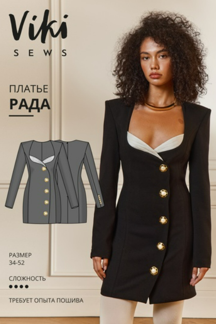 Выкройка платья прилегающего силуэта. На полочках и спинке рельефы. На полочке функциональная застежка на петли и пуговицы со смещением. В среднем шве спинки потайная молния. Спереди глубокий вырез, с декоративными вставками из отделочной ткани. Рукава длинные, втачные, двухшовные, малого объема. В локтевом шве рукава шлица на пришивные пуговицы. Платье на притачной подкладке. Длина платья выше колен.