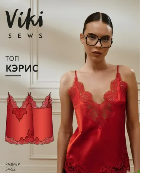 Выкройка топа умеренного объема, прямого силуэта. Топ в бельевом стиле, на тонких регулируемых бретелях. На деталях переда нагрудные вытачки, переведенные в боковой шов. Верхний срез спинки обработан косой бейкой. На переде фигурные кружевные вставки по горловине и пройме. Вырез горловины переда V-образной формы. Низ обработан фигурным кружевом. Длина топа до линии бедер.