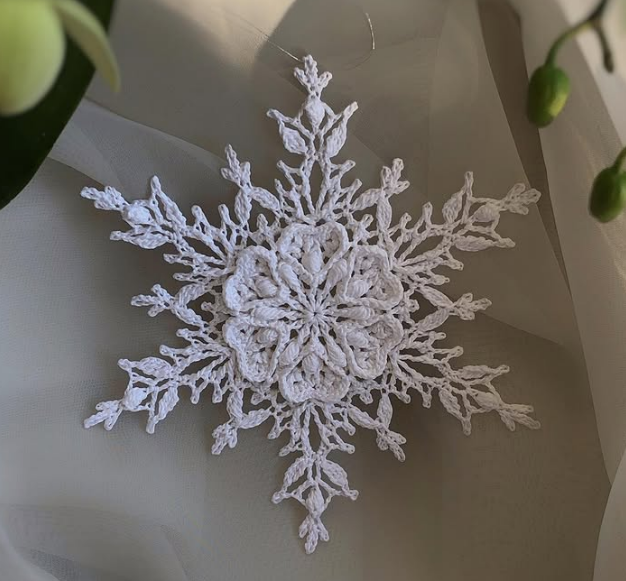 Файл .pdf (7 страниц) содержит пошаговое описание и схему вязания снежинки "Любовь" на русском языке.
