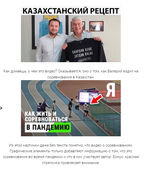 Из этой картинки даже без текста понятно, что видео о соревнованиях. Графические элементы только добавляют информацию о том, что это соревнования во время пандемии и что в них участвует автор. Бонус: красная стрелочка привлекает внимание.