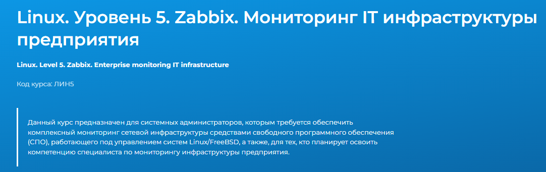 Данный курс предназначен для системных администраторов, которым требуется обеспечить комплексный мониторинг сетевой инфраструктуры средствами свободного программного обеспечения (СПО), работающего под управлением систем Linux/FreeBSD, а также, для тех, кто планирует освоить компетенцию специалиста по мониторингу инфраструктуры предприятия.