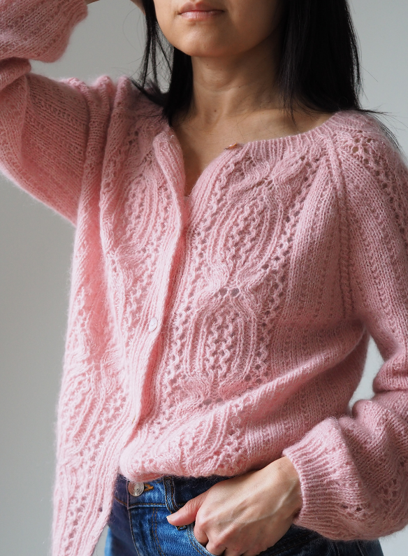 Очень женственный и нежный кардиган, украшенный панелями интересного ажурного узора с косичками.