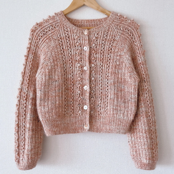 Кардиган вяжется без швов, сверху вниз, начиная с прибавок реглана для кокетки и, в то же время, выполняя планки полочек. Сразу после завершения кокетки, петли рукавов снимаются на удержание, и узором вяжется тело, продолжая планки, вплоть до нижнего края, который завершается резинкой 1x1. После завершения тела, вяжутся по кругу рукава. В завершении поднимаются петли горловины и вяжется планка горловины резинкой 1x1.