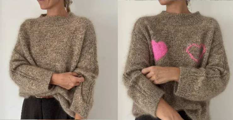 Свитер вяжется лицевой гладью с декоративной косичкой по верху плеч и центру рукавов до начала манжета. После окончания работы при желании Вы можете вышить два сердечка (или одно, если хотите) по линии груди. Предложено два варианта: полностью закрашенное сердечко или контур сердечка). Вы можете вышить сердечки и в любом другом месте корпуса.