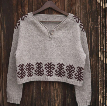 Пуловер Niubо вяжется без швов, сверху вниз, начиная от кокетки. Сначала кокетка выполняется поворотными рядами, до достижения нужной глубины выреза горловины переда, затем круговыми рядами до низа пройм. Одновременно происходит формирование кокетки сначала за счет прибавок около панелей плеч и дополнительных прибавок для спинки, затем добавляются прибавки для формирования закругления горловины переда. После достижения нужной ширины плеч начинаются прибавки для формирования верхней части рукавов (по аналогии с прибавками для кокетки-реглан). После отделения рукавов вяжется корпус, круговыми рядами до низа. Далее вяжутся рукава, также круговыми рядами до низа. В конце работы выполняется планка горловины (с петлицами или без, при желании), петли планки закрываются полым шнуром. В ходе работы Вы будете вязать жаккардовый узор, сначала в технике интарсии (когда будет выполняться кокетка поворотными рядами), затем круговыми рядами.
