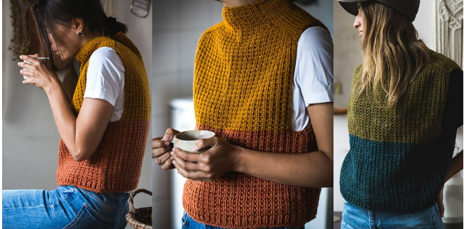 В сочетании с брюбками и юбками любого фасона, такой жилет станет вашим любимцем, даже не сомневайтесь. Ломаная резинка очень удачно сочетается с фасоном жилета, а метод колорблок эффектно дополняет этот альянс. Оставшиеся от других проектов нитки прекрасно подойдут для этой модели, освободив место для новых ниточек.