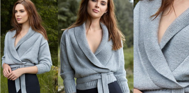Элегантный кардиган с запахом с рукавом 3/4 и воротником платочной вязкой, вязаный спицами из пряжи с альпакой.vjazhi.ru