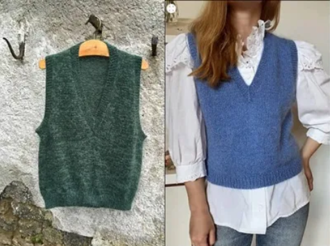 Жилет вяжется спицами сверху вниз. Сначала выполняется верхняя часть спинки с наклоном плеч, создавая трендовое японское плечо, затем выполнить обе стороны переда, прежде чем соединить три детали для работы по кругу.