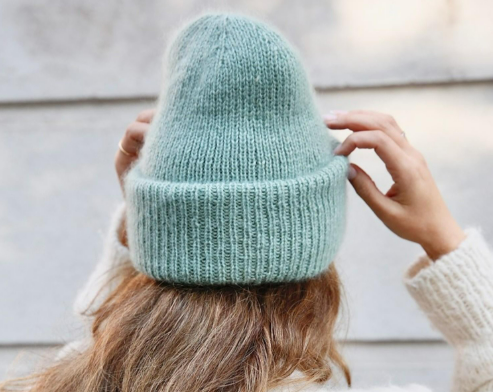 Модная и стильная повседневная шапка, связанная обычной резинкой 1 х 1. Дизайн шапки предполагает трехслойный высокий отворот и немного удлиненную и заостренную макушку, сформированную за счет убавок.