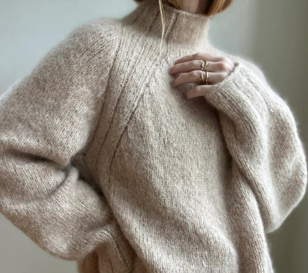 Теплый и уютный свитер с красиво обыгранными линиями реглана, высоким воротником-стойкой и боковыми разрезами по низу корпуса.