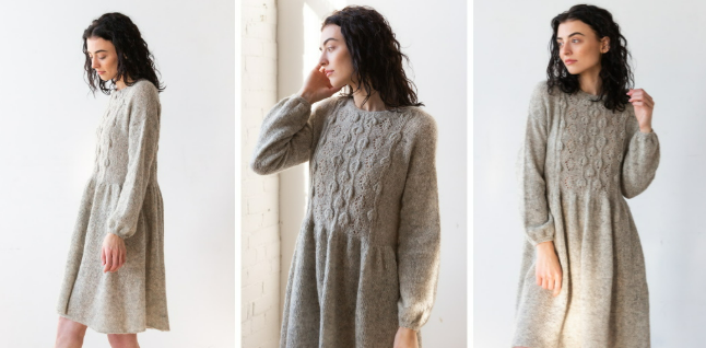 Это платье вяжется спицами по кругу одной деталью. Работа начинается от талии. Сначала вяжется лиф снизу вверх с формированием бюста и плеч. После этого вяжутся рукава от проймы, а затем юбка. Широкое и свободное, такое платье может скорректировать фигуру, добавить ей женственности и нежности. Слегка широкие рукава, собранные узкой манжетой, помогут подчеркнуть тонкие запястья, а широкая и длинная юбка скорректирует низ фигуры.