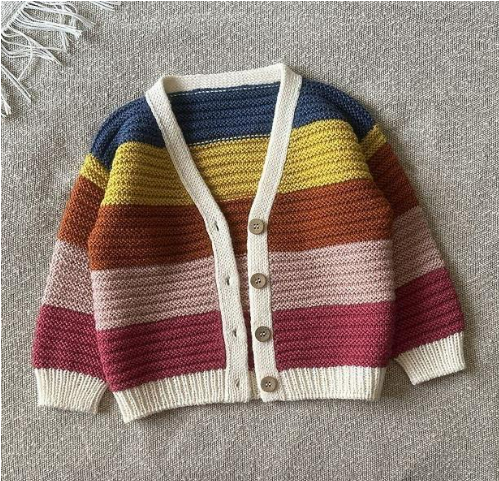 Симпатичный стильный кардиган для девочек вяжется спицами цветными полосами фактурным узором сверху вниз.vjazhi.ru