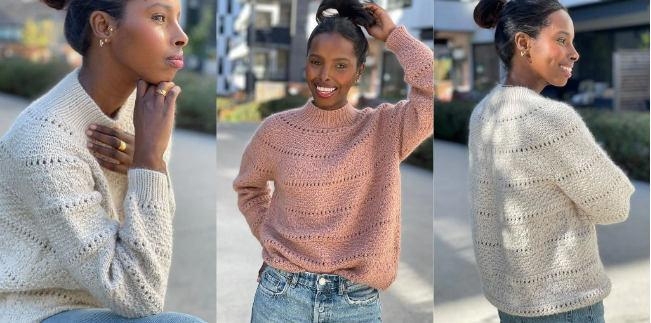 Прекрасный свитер оверсайз с круглой кокеткой выполняется спицами теневыми узорами, сложив нить мериноса Bystrikk Merino и 1 нить мохера Tynn Kidsilk Erle.