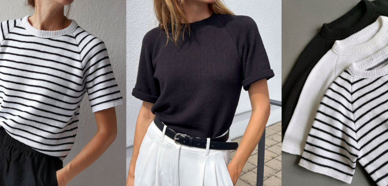 Женский топ реглан от дизайнера Susanne Müller, будь то однотонная или полосатая версия, универсальный, легко комбинируется и идеально подходит для весны и лета. Топ вяжется спицами без швов сверху вниз. Сначала вырез горловины формируется укороченными