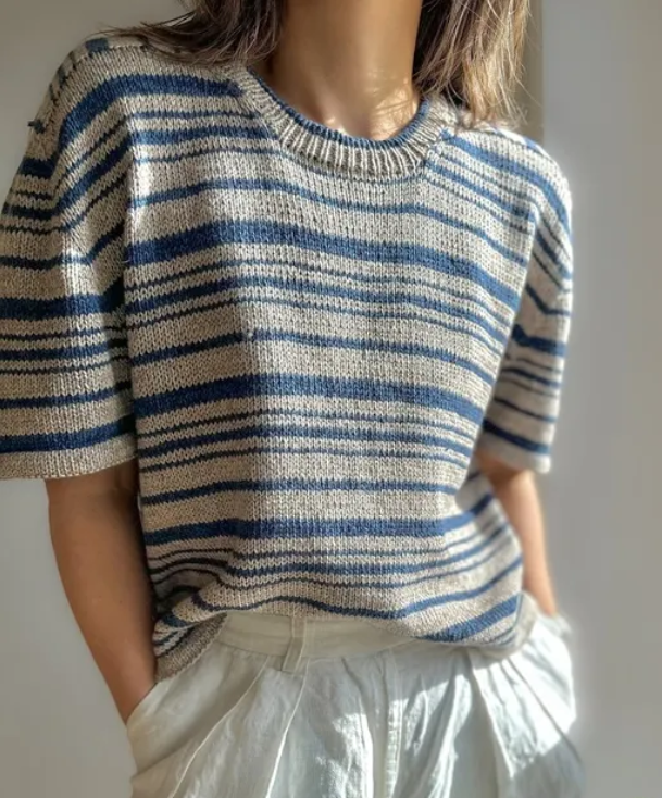 Эффектный летний топ с чередованием узких и широких полос двух цветов для стильного повседневного гардероба.