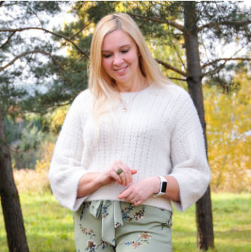 Блуза связана в три сложения нити: две нити шерстяной пряжи с шелком и одна нить полиамидной пряжи с плюшевым пухом. Итоговый метраж в три сложения – 271 м/100 г.