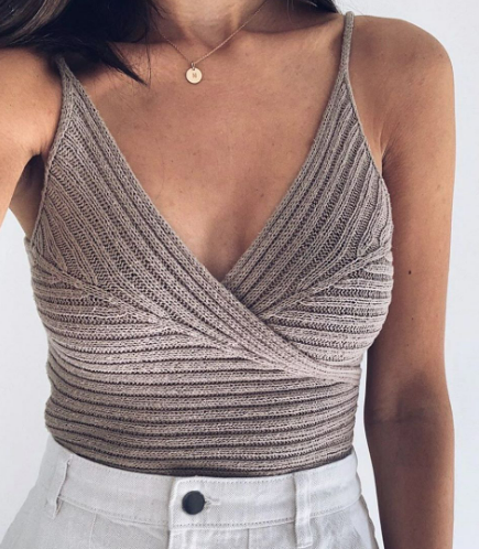 Элегантный топ с запАхом и на тонких лямках, вязанный спицами поперёк узором резинкой.