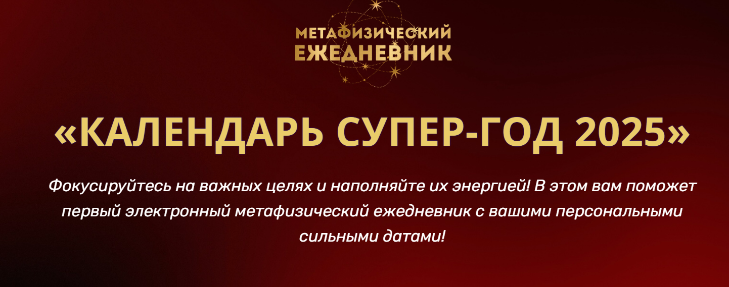 Фокусируйтесь на важных целях и наполняйте их энергией! В этом вам поможет первый электронный метафизический ежедневник с вашими персональными сильными датами!vladimirzakharov.com