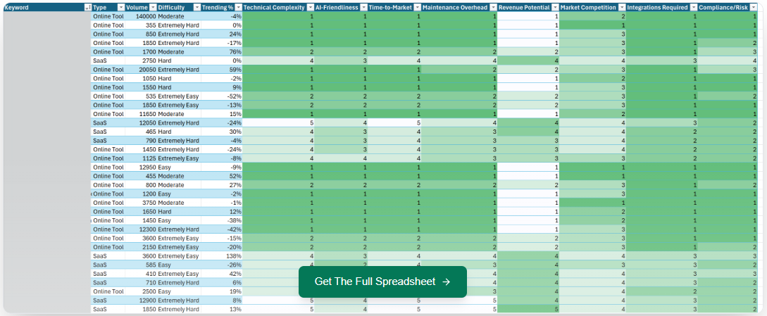 Сортируйте идеи по уровню сложности, AI-дружелюбности, сложности продвижения, конкуренции и другим параметрам, чтобы найти проект, идеально подходящий под ваши навыки.