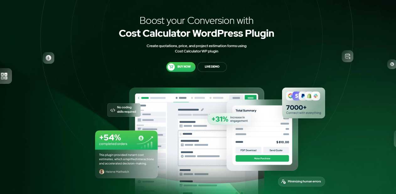 Cost Calculator интегрируется с такими популярными сервисами, как PayPal и Stripe, что позволяет клиентам сразу оплачивать расчётную стоимость. Плагин также поддерживает отправку уведомлений на электронную почту после заполнения формы, предоставляя возможность сохранять все данные для дальнейшего анализа.