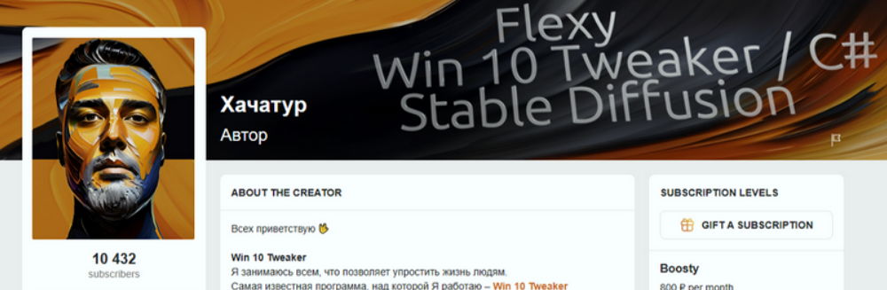 Всех приветствую 🤟 Win 10 Tweaker Я занимаюсь всем, что позволяет упростить жизнь людям. Самая известная программа, над которой Я работаю – Win 10 Tweaker ЛУЧШИЙ СЕРВИС ГЕНЕРАЦИИ КОНТЕНТА ➜ FLEXY ============================================================ Stable Diffusion Мой...boosty.to